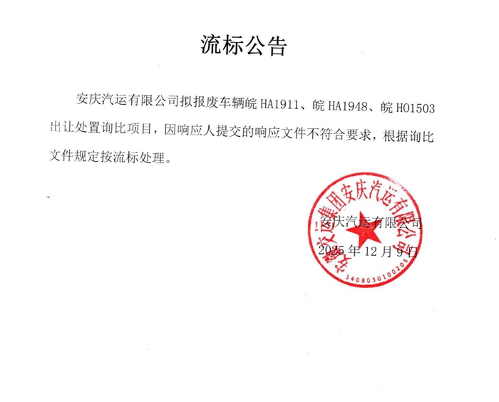 擬報(bào)廢公務(wù)車(chē)皖HA1911、皖HA1948、皖HO1503出讓處置流標(biāo)公告