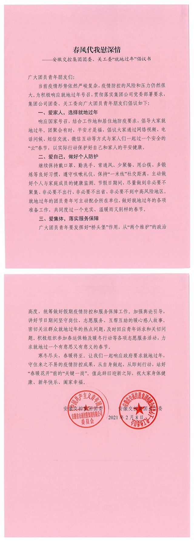 安徽交控集團(tuán)團(tuán)委、關(guān)工委“就地過(guò)年”倡議書(shū)